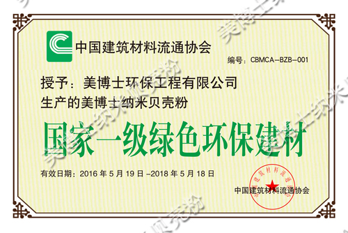 中國建筑材料流通協(xié)會又授予美博士納米貝殼粉國家一級綠色環(huán)保建材稱號。有效日期從2016年5月19號到2018年5月18號。